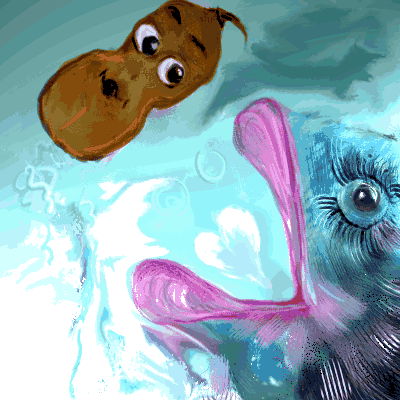 The little peanut and the fish lay on the wet ground. The little peanut couldnt get back up into the peanut tree and the friendly fish couldnt return to the brook ... but they were both very happy.